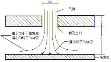圖1給出不同空氣動力學等效直徑的粒子在人體呼吸系統中的沉降部位,采樣器的設計盡可能模擬這一特性。慣性撞擊原理早在五十年代就已經提出來了。圖2給出一個噴孔附近粒子運動軌跡的示意圖。在一定的氣流速度時,一些慣性較大的粒子將撞擊到采集板上,而那些慣性較小的粒子則隨氣流繞行而進入下一級,在噴孔的幾何尺寸和氣流速度一定的條件下,不同空氣動力學等效直徑的粒子其撞擊概率是不同的,其特性可用撞擊效率曲線,一般常用撞擊效率為50%的直徑值作為這一級撞擊器的截斷直徑,并假設空氣動力學等效直徑大于截斷直徑的粒子將被100%地撞擊。